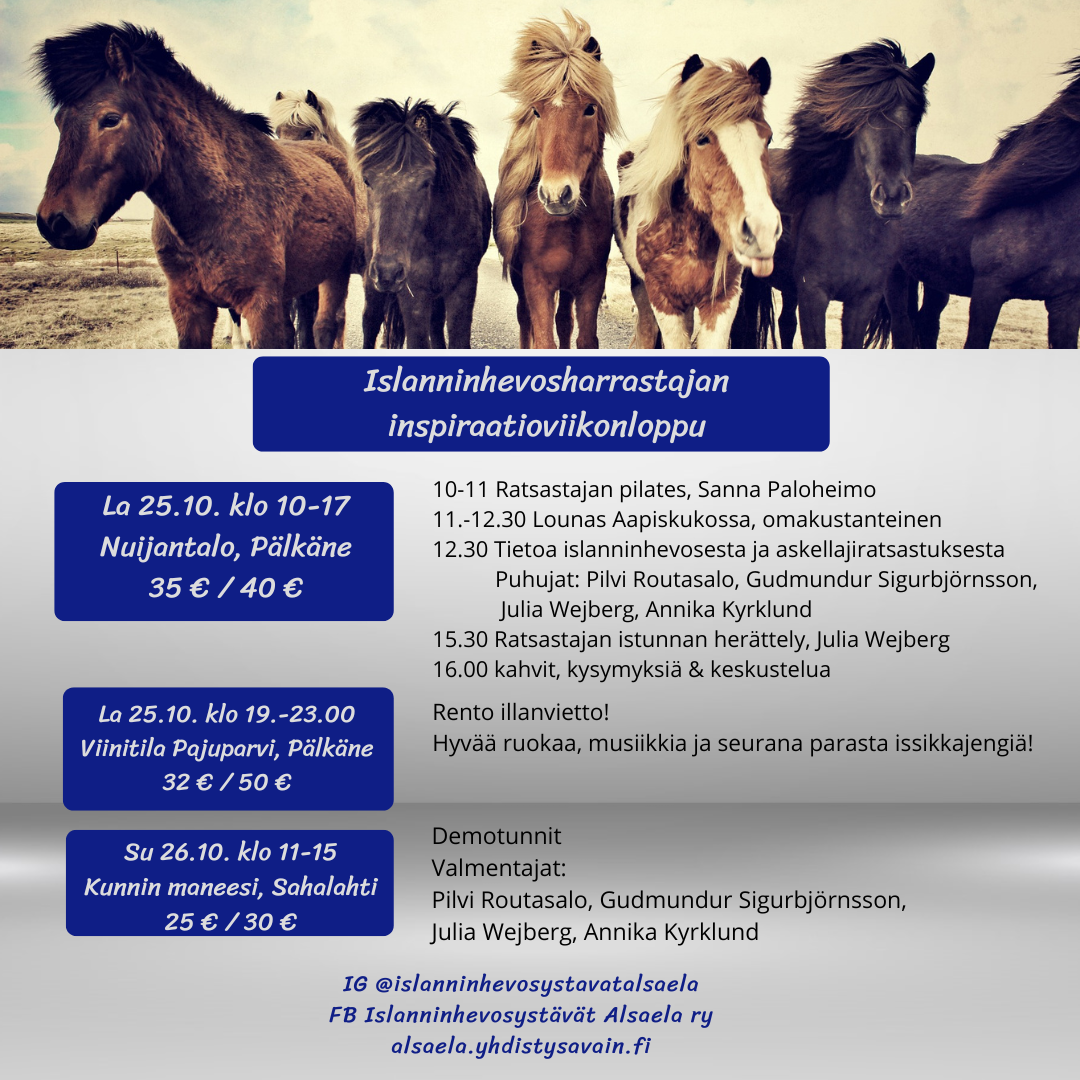 Alsaela järjestää islanninhevosharrastajille inspiroivan viikonlopun Pälkäneellä ja Kangasalla 25.-26.10.2025. Ilmoittaudu nyt mukaan! Ilmoittautuminen päättyy pe 10.10. Syksyyn tarjolla valoa, iloa,…