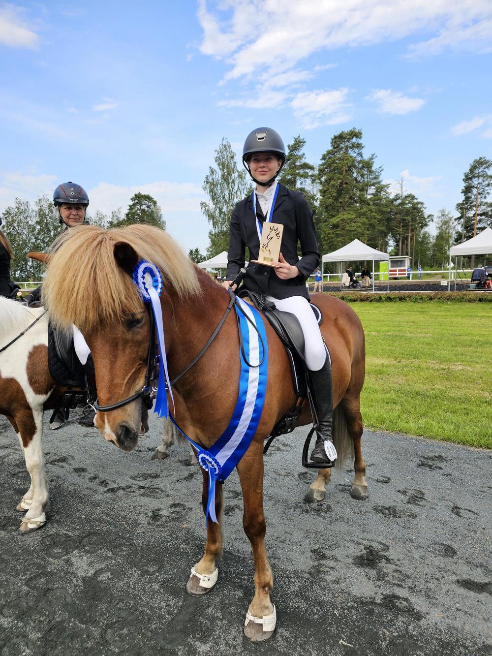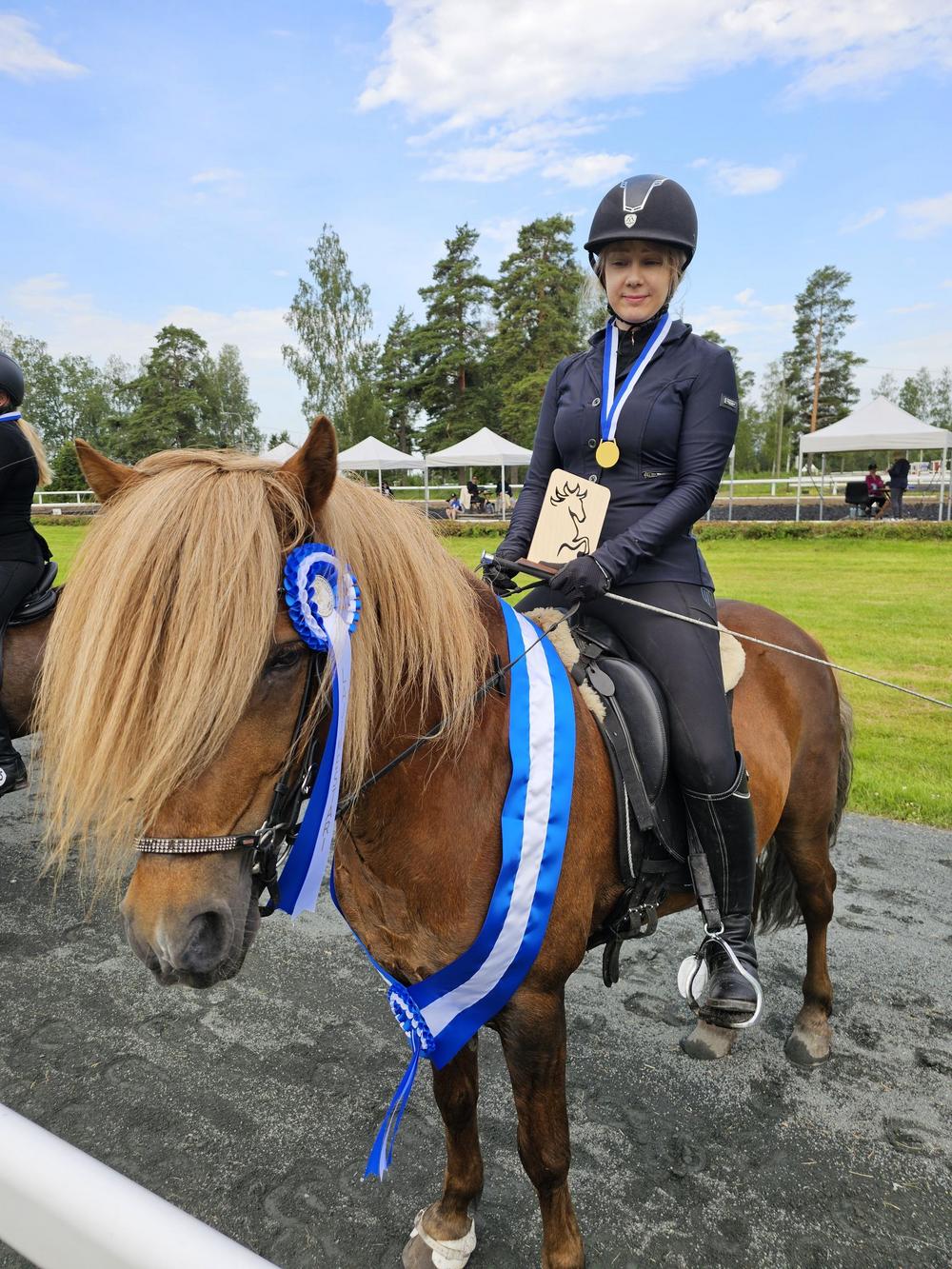 Islanninhevosten askellajiratsastuksen Suomenmestaruuskilpailut jatkuivat lauantain aurinkoisessa säässä tölttiluokka T5 finaalilla. Luokassa T5 esitetään eri osioina hidasta tölttiä, temponvaihteluita sekä tölttiä keskitemposta lisättyyn. Finaalissa nähtiin jännittävä ja tasaväkinen kilpailu, jonka senioreiden Lajimestaruuden voitti Annika Bärman ja Völur fra Gedehøjgård. Tasapistein 5,22 täpärästi toiseksi jäi Marianna Hanni ja Atli från Frihamra. Nuorten Lajimestaruuden vei Miisa-Maria Makkonen ja Kjarkur fra Furum pistein 5,06.